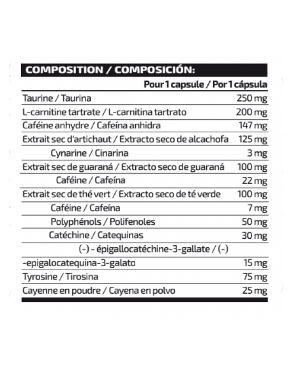 Ένα θερμογόνο προϊόν ιδανικό για την αντιμετώπιση όλων των αισθητικών στόχων, τέλειο για να το λάβετε πριν από μια φυσική δραστηριότητα, αποτελούμενο από αμινοξέα, εκχυλίσματα φυτών και καφεΐνη.
